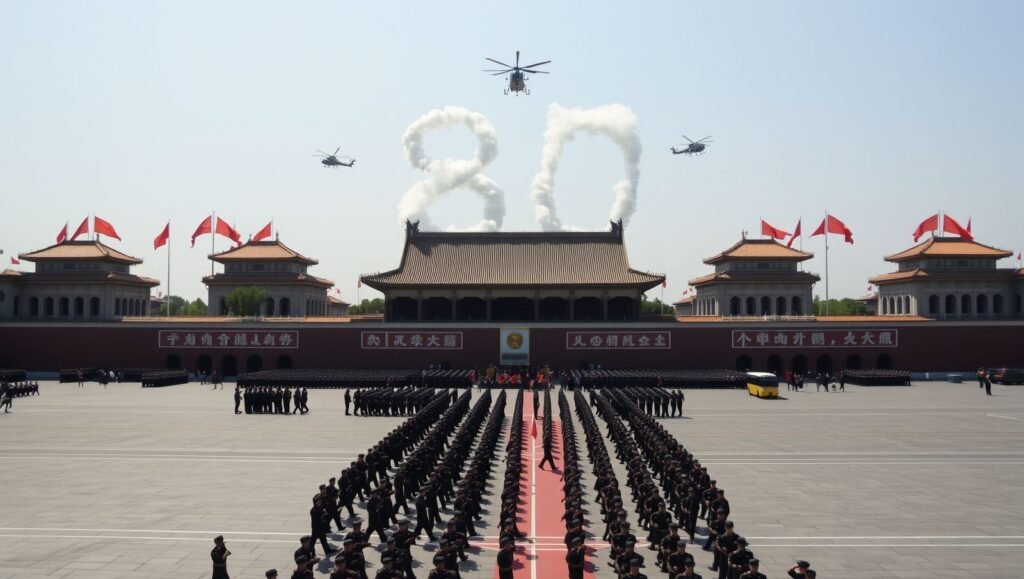 在天安門廣場,空中護旗梯隊率先登場,26架直升機編隊飛出「80」字樣,象徵80周年。隨後三架直升機分別懸掛「正義必勝」、「和平必勝」和「人民必勝」標語,掠過城樓上空。
